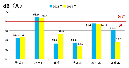 2019年全市城市道路交通噪声平均等效声级为65.0分贝,处于“好”等级,各市(区)道路交通噪声平均等效声级在62.7~68.6分贝之间,除高港区处于“较好”等级,其余各市(区)均处于“好”等级。各市(区)道路交通噪声质量同比均保持稳定。具体见图1。