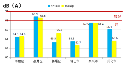 图1 2019年泰州各市(区)道路交通噪声同比图